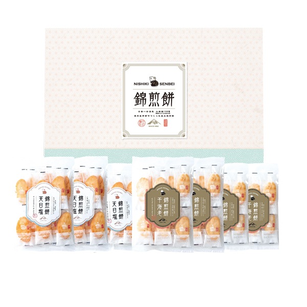 ●原材料名:【錦煎餅 天日塩】うるち米(国産山田錦)、米油、塩(天日塩5%使用)、昆布粉末、鰹節粉【錦煎餅 干海老】うるち米(国産山田錦)、米油、干海老、塩、昆布粉末、鰹節粉
