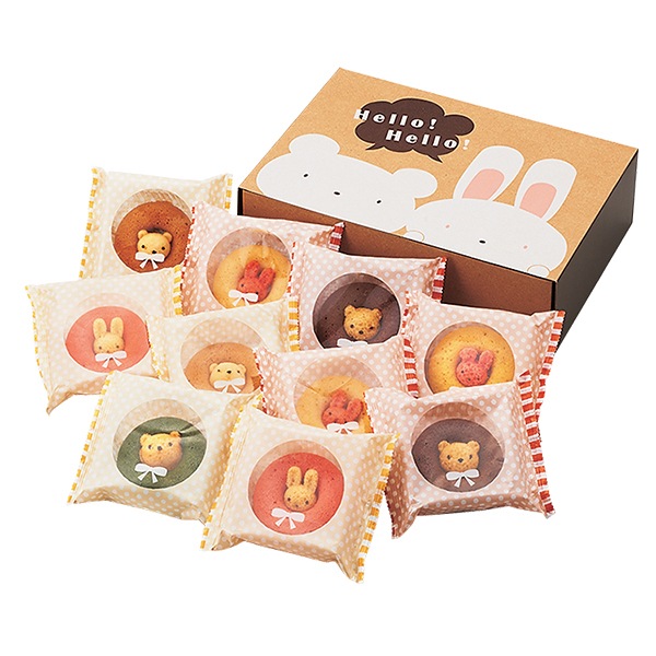 ●原材料名:【うさぎイチゴ】卵(国産)、砂糖、小麦粉、マーガリン、食用植物油脂、アーモンドパウダー、いちごペースト、蜂蜜、発酵調味料、食塩、ココアパウダー、寒天、牛乳/トレハロース、膨張剤、香料、安定剤(増粘多糖類)、着色料(紅麹、コチニール、クチナシ、カロテン)、酸味料、乳化剤、酸化防止剤(V.E)、(一部に卵・乳成分・小麦・アーモンド・大豆・りんごを含む)【うさぎプレーン】卵(国産)、砂糖、小麦粉、マーガリン、食用植物油脂、アーモンドパウダー、蜂蜜、発酵調味料、いちごペースト、食塩、ココアパウダー、寒天、牛乳/トレハロース、膨張剤、安定剤(増粘多糖類)、香料、乳化剤、着色料(紅麹、コチニール、クチナシ、カロテン)、酸味料、酸化防止剤(V.E)、(一部に卵・乳成分・小麦・アーモンド・大豆・りんごを含む)【うさぎバナナ】卵(国産)、砂糖、小麦粉、マーガリン、食用植物油脂、アーモンドパウダー、バナナペースト、蜂蜜、発酵調味料、いちごペースト、食塩、ココアパウダー、寒天、牛乳/トレハロース、膨張剤、香料、安定剤(増粘多糖類)、乳化剤、着色料(紅麹、カロテン、コチニール、クチナシ)、酸味料、酸化防止剤(V.E)、(一部に卵・乳成分・小麦・アーモンド・大豆・りんご・バナナを含む)【くまチョコ】卵(国産)、砂糖、小麦粉、マーガリン、食用植物油脂、準チョコレート、アーモンドパウダー、蜂蜜、発酵調味料、ココアパウダー、食塩、牛乳、寒天/トレハロース、膨張剤、安定剤(増粘多糖類)、香料、乳化剤、酸化防止剤(V.E)、酸味料、着色料(カロテン)、(一部に卵・乳成分・小麦・アーモンド・大豆・りんごを含む)【くま抹茶】卵(国産)、砂糖、小麦粉、マーガリン、食用植物油脂、アーモンドパウダー、蜂蜜、抹茶ペースト、抹茶、発酵調味料、食塩、ココアパウダー、寒天、牛乳/トレハロース、膨張剤、香料、安定剤(増粘多糖類)、着色料(クチナシ、カロテン)、乳化剤、酸化防止剤(V.E)、(一部に卵・乳成分・小麦・アーモンド・大豆・りんごを含む)【くまキャラメル】卵(国産)、砂糖、小麦粉、マーガリン、食用植物油脂、アーモンドパウダー、蜂蜜、キャラメルパウダー加工品、発酵調味料、食塩、ココアパウダー、寒天、牛乳/トレハロース、着色料(カラメル、カロテン)、膨張剤、香料、安定剤(増粘多糖類)、乳化剤、酸化防止剤(V.E)、酸味料、(一部に卵・乳成分・小麦・アーモンド・大豆・りんごを含む)