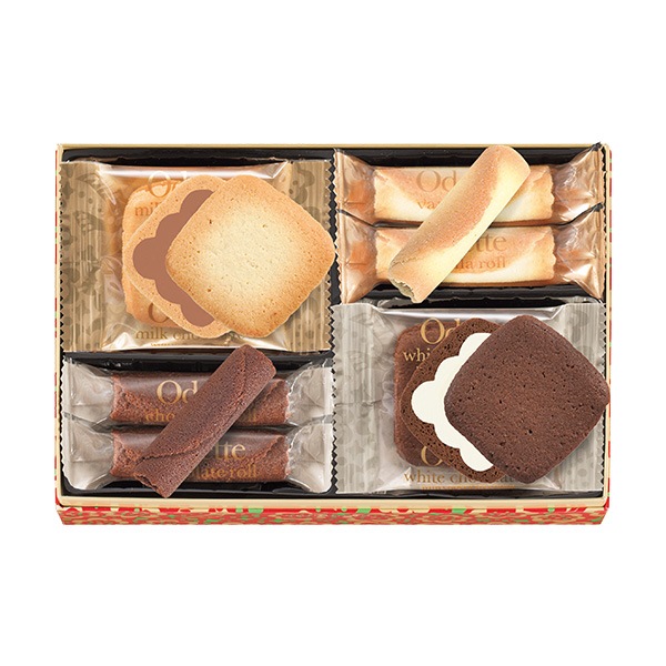 ●商品内容 オデット(ミルクチョコレート、ホワイトチョコレート×各3)、バニラロール×3、チョコレートロール×3 ●パッケージサイズ 126×185×51mm ●賞味期限 製造後345日 ●アレルギー 小麦・卵・乳