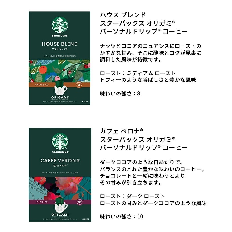 ●商品内容:スターバックス オリガミ パーソナルドリップ コーヒー9g×4P×2(ハウス ブレンド・カフェ ベロナ×各1)