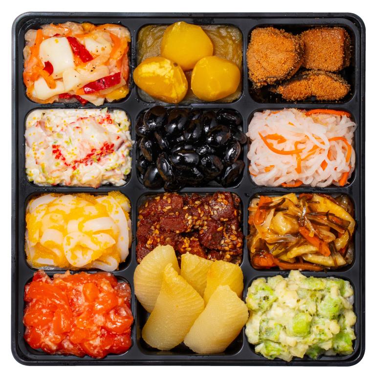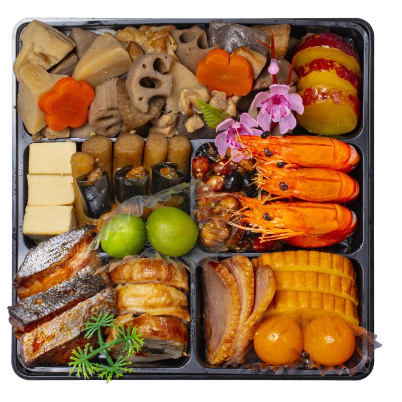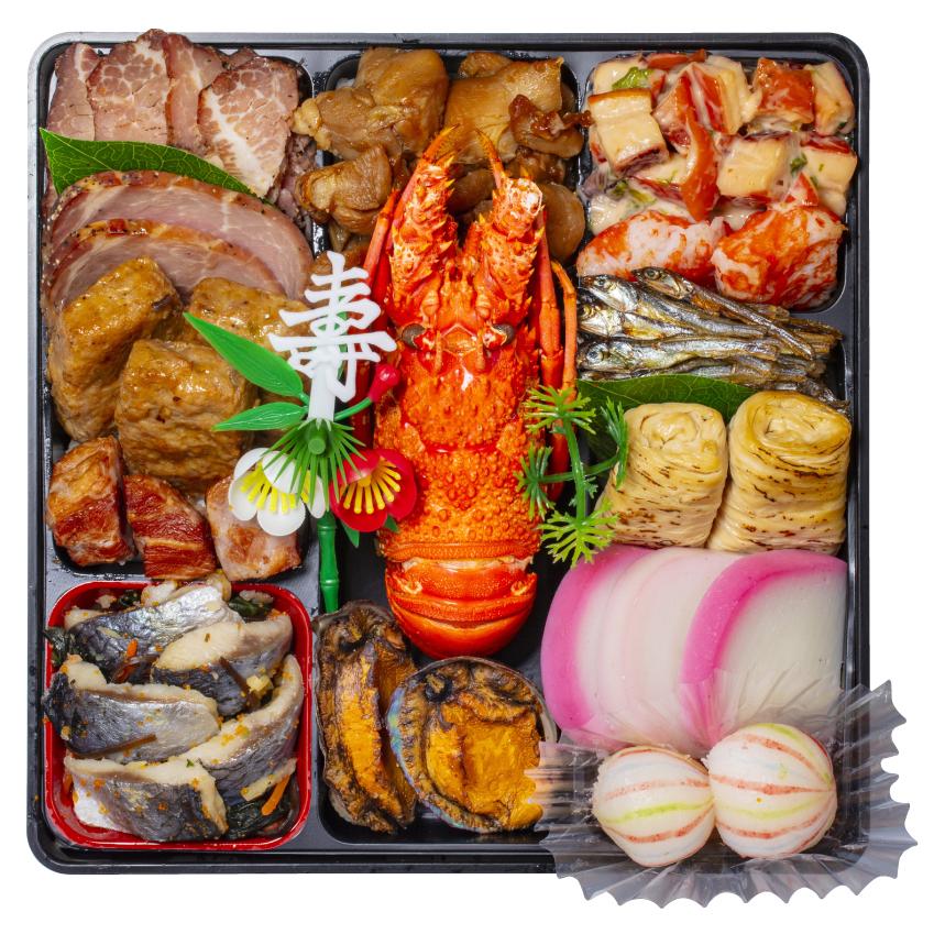 ポークパストラミ、ローストポーク、中華風のし鶏(八角風味)、合鴨スモーク、にしん大漁漬け、若鶏照り焼き、ロブスター、鮑のうま煮、イカのゴロゴロサラダ、タラバ風味かまぼこ、たつくり、焼湯葉巻、紅白蒲鉾、京餅手まり