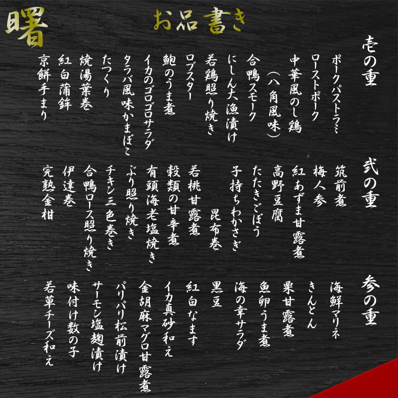 筑前煮、梅人参、紅あずま甘露煮、高野豆腐、たたきごぼう、子持ちわかさぎ昆布巻、若桃甘露煮、穀類の甘辛煮、有頭海老塩焼き、ぶり照り焼き、チキン三色巻き、合鴨ロース照り焼き、伊達巻、完熟金柑