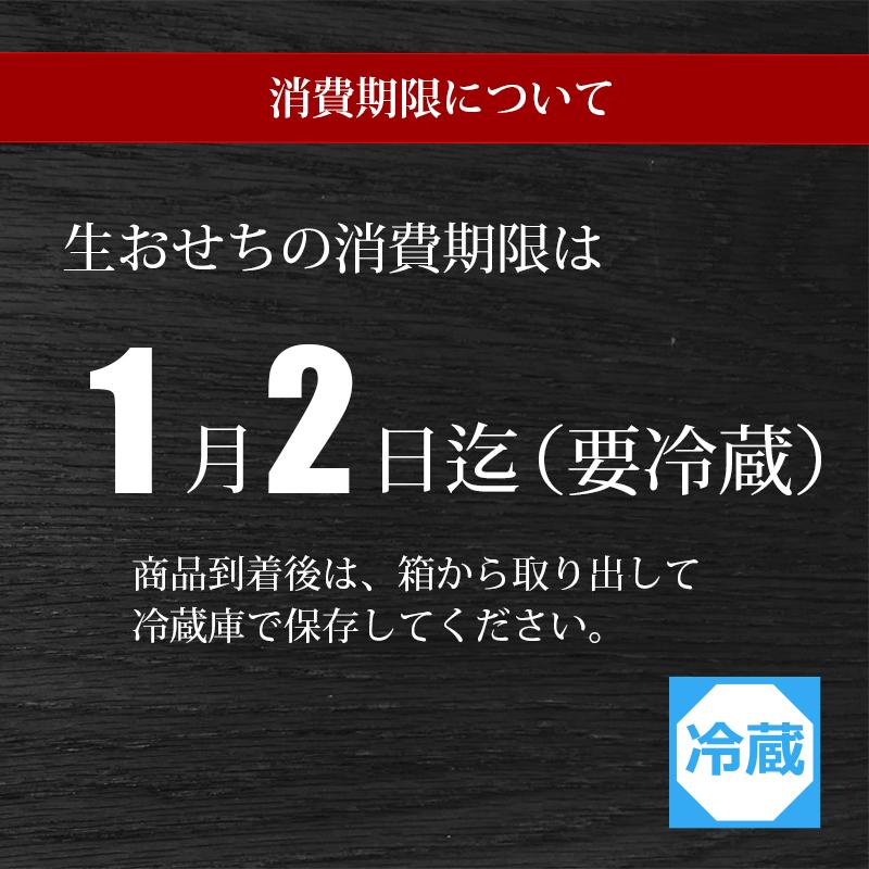 ●内容:(全53品)にしん大漁漬け、イカ真砂和え、サーモン塩麹漬け、黒豆、きんとん、栗甘露煮、紅白なます、魚卵うま煮、筑前煮、梅人参、高野豆腐、穂先筍、子持ちわかさぎ昆布巻、たつくり、有頭海老塩焼き、市松蒲鉾、味付け数の子、若桃甘露煮、キングサーモン西京焼き、焼湯葉巻、伊達巻、紅あずま甘露煮、京餅手まり、酢豚、スモークチキン中華、合鴨ロース照り焼き、中華帆立ひも、中華くらげ、にしん奉書巻き、海老チリソース、若鶏照り焼き、中華肉団子、豚角煮、チキン三色巻き、イカ黄金焼、ゴマ団子、中華風のし鶏(八角風味)、完熟金柑、海鮮マリネ、海老の錦ロール、若草チーズ和え、イカのゴロゴロサラダ、海老マヨネーズ、海の幸サラダ 他 全53品