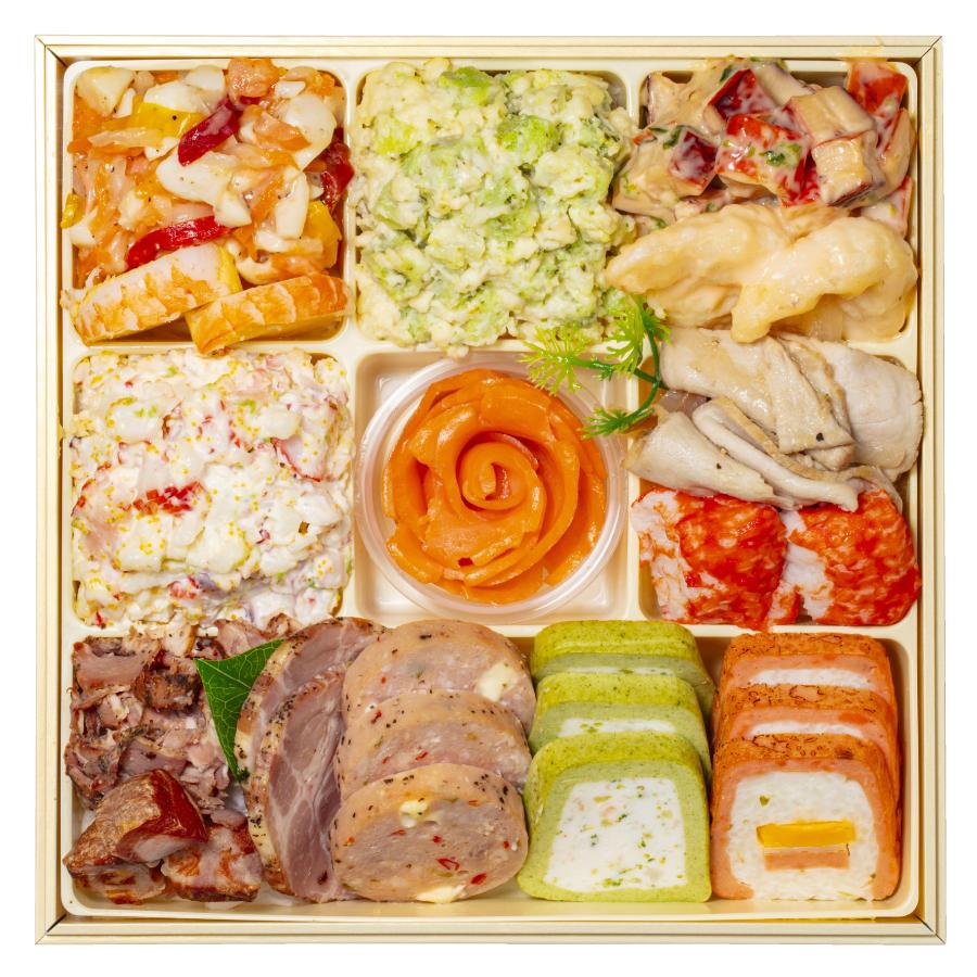 海鮮マリネ、海老の錦ロール、若草チーズ和え、イカのゴロゴロサラダ、海老マヨネーズ、海の幸サラダ、ローズサーモン 、豚ロース肉のさっぱりマリネ、タラバ風味かまぼこ、ポークパストラミ、ローストポーク、合鴨スモーク、豚肉とチーズのテリーヌ、海老とブロッコリーのテリーヌ、サーモンチーズ巻