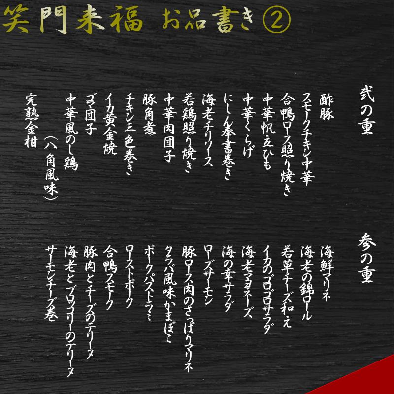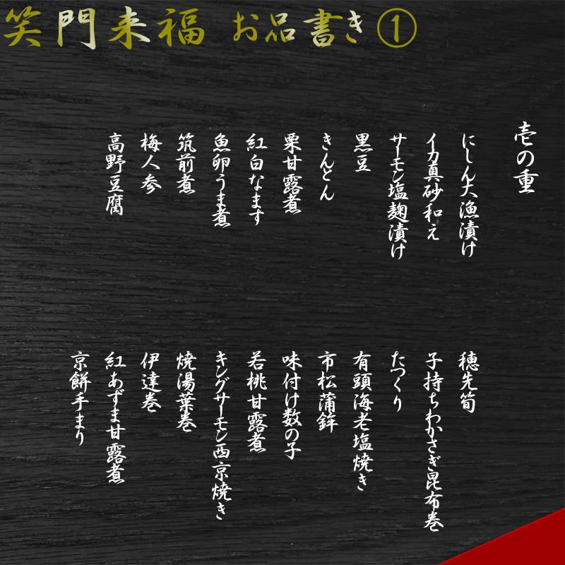 にしん大漁漬け、イカ真砂和え、サーモン塩麹漬け、黒豆、きんとん、栗甘露煮、紅白なます、魚卵うま煮、筑前煮、梅人参、高野豆腐、穂先筍、子持ちわかさぎ昆布巻、たつくり、有頭海老塩焼き、市松蒲鉾、味付け数の子、若桃甘露煮、キングサーモン西京焼き、焼湯葉巻、伊達巻、紅あずま甘露煮、京餅手まり