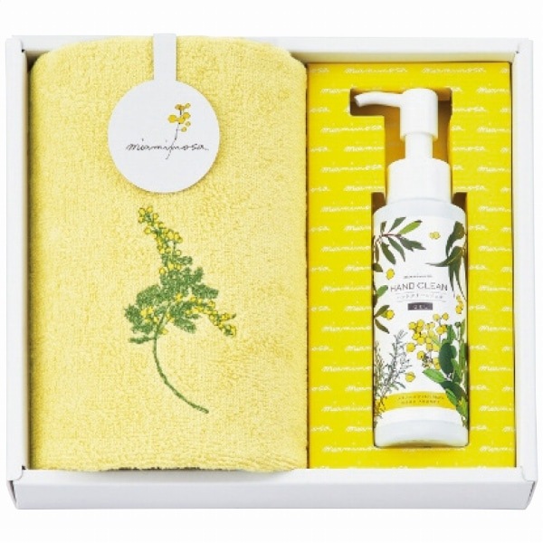 春を告げる花ミモザをモチーフとした今治タオルと、保湿成分ヒアルロン酸と、香料(ティーツリー・ユーカリ・ニアウリ・ラヴィンサラ・ミモザ)のアロマ精油を配合した、ほんのりとアロマの香り漂うハンドクリーンジェルのセットです。