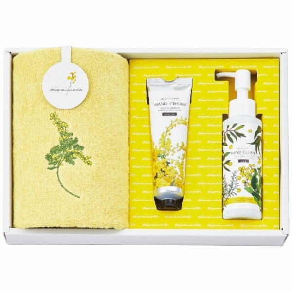 天然香料ミモザ精油がふんわりと柔らかく香る、するすると伸びる滑らかな使い心地のハンドクリームと、保湿成分ヒアルロン酸と、香料(ティーツリー・ユーカリ・ニアウリ・ラヴィンサラ・ミモザ)のアロマ精油を配合した、ほんのりとアロマの香り漂うハンドクリーンジェルと、春を告げる花ミモザをモチーフとした今治タオルのセットです。