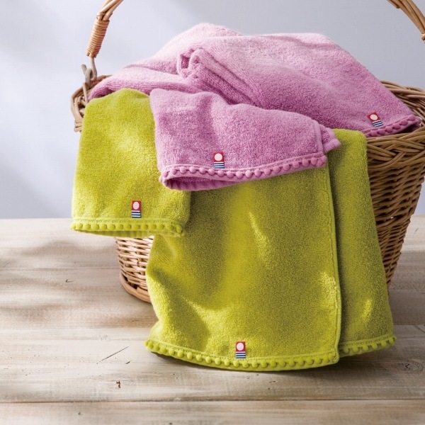 大人っぽいピスタチオカラーにかわいらしいポンポンを付けたタオルです。やわらかくて肌触りの良い無撚糸を使用しています。