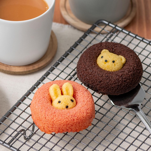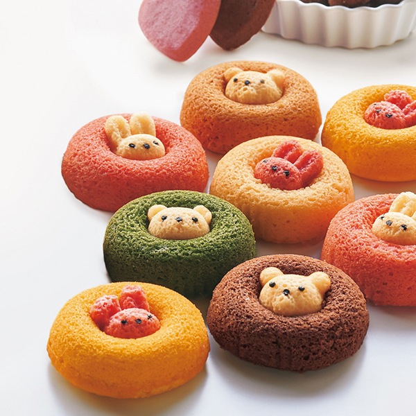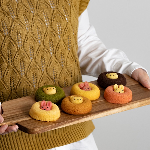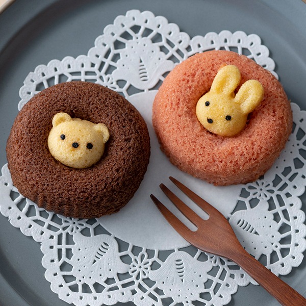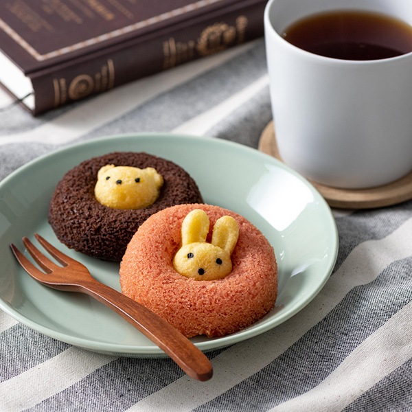 真ん中から動物たちがひょっこり顔を出した焼きドーナツ。その愛嬌のある見た目は、食べるのがもったいなくなるほど。かわいいボックスがギフトにもぴったりです。