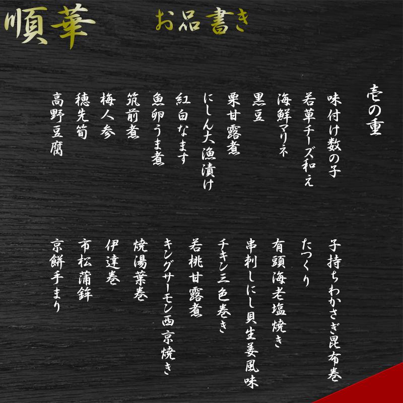 味付け数の子、若草チーズ和え、海鮮マリネ、黒豆、栗甘露煮、にしん大漁漬け、紅白なます、魚卵うま煮、筑前煮、梅人参、穂先筍、高野豆腐、子持ちわかさぎ昆布巻、たつくり、有頭海老塩焼き、串刺しにし貝生姜風味、チキン三色巻き、若桃甘露煮、キングサーモン西京焼き、焼湯葉巻、伊達巻、市松蒲鉾、京餅手まり